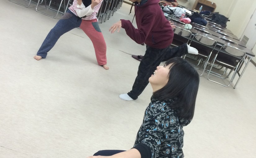 後半は相づちをテーマに、ペアの片方が話しかけ、もう片方がひたすら相づちをうつ(例えば「うん」とか「ううん」といったような)という台本をつかって、登場人物のキャラクターや設定をつけることで相づちの見え方がどう変わるか見てみよう、というようなワークをしました。
