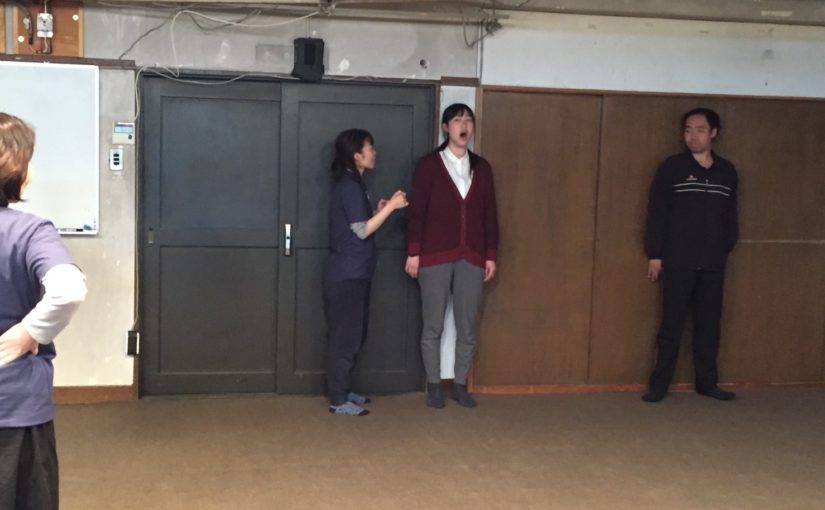 長く声を出す長音や、滑舌、アクセント、遠くにいる相手に声を届ける発声など、様々な声の出し方を行いました。