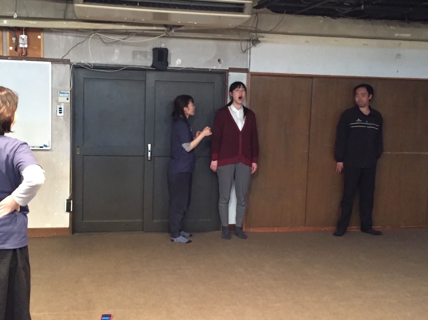 長く声を出す長音や、滑舌、アクセント、遠くにいる相手に声を届ける発声など、様々な声の出し方を行いました。