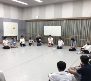 まず初めは、親交を深める為に、お互いに挨拶をしたり、隣の人の声をマネして次の人にパスをまわしてしていくワークです。