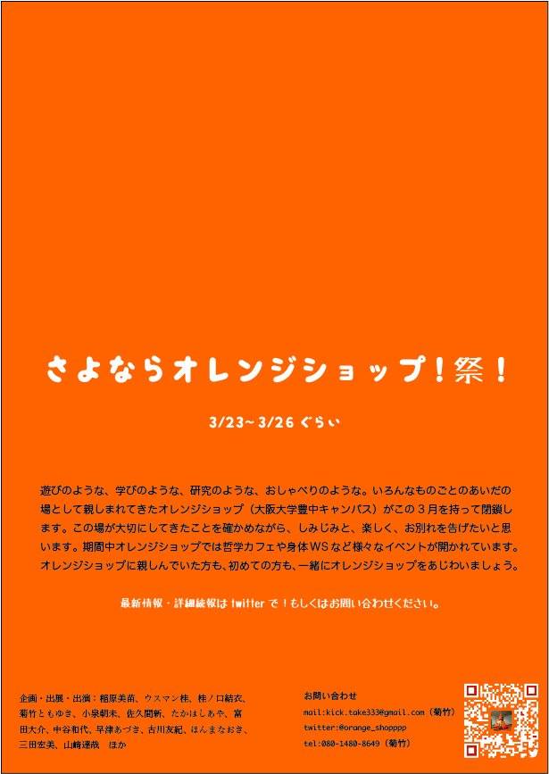 大阪大学の中で、実験的な試みの場として親しまれてきたスペース「オレンジショップ」に、楽しくしみじみとお別れを告げるお祭りです。
